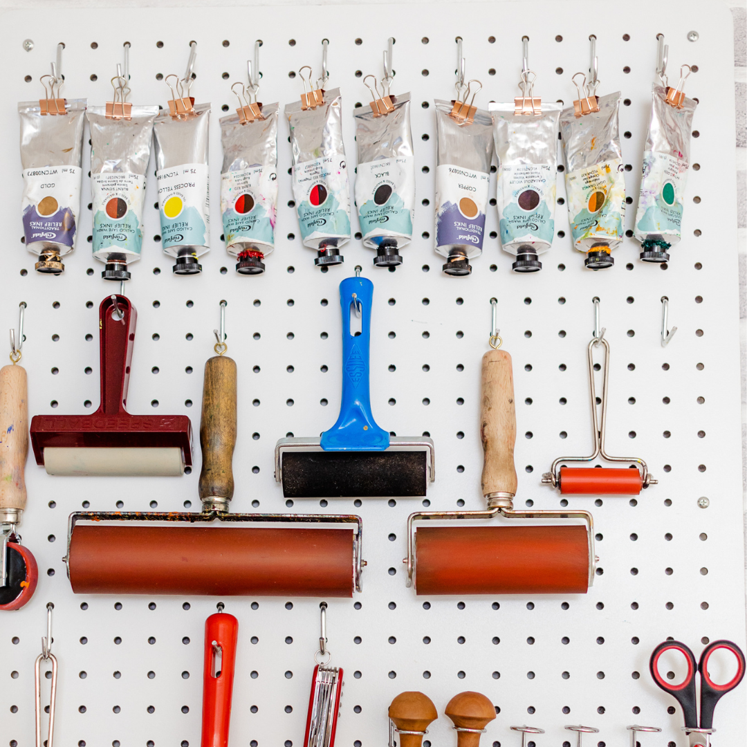 There’s something about seeing all my paints and rollers hanging up, organised into colours that makes me happier than a kid eating cake!