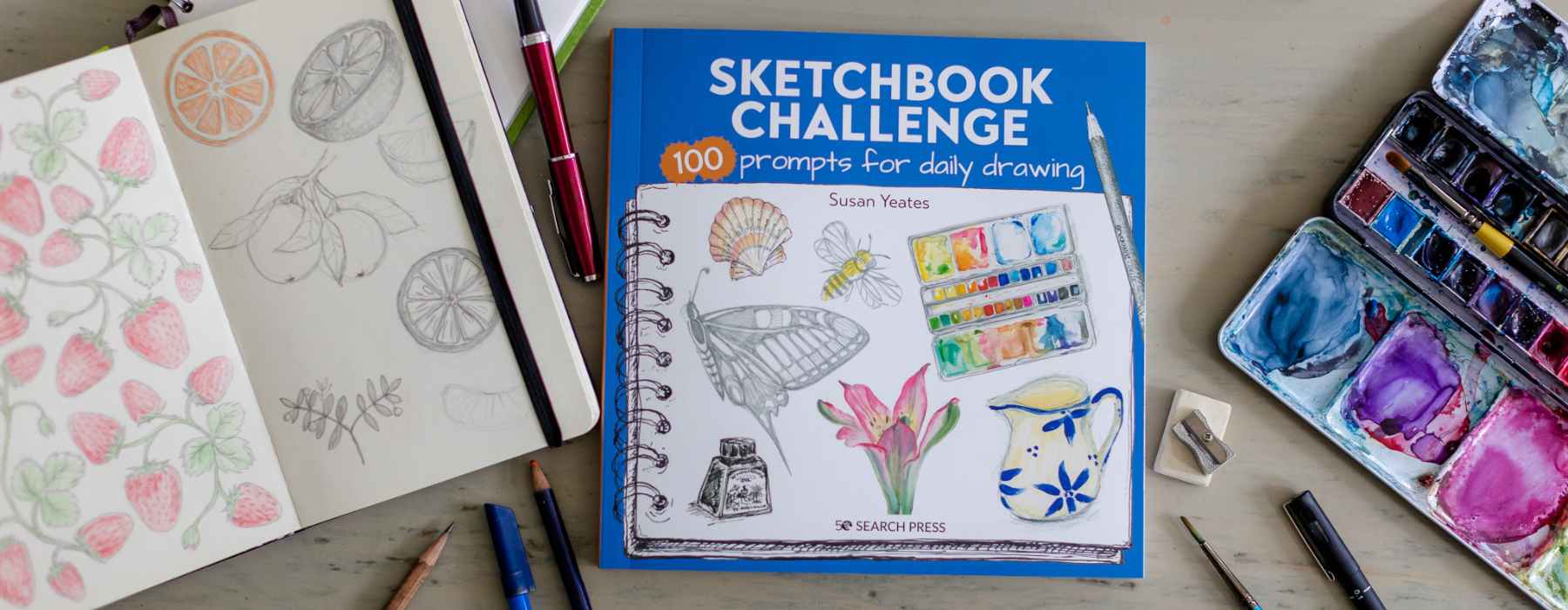 Sketchbook Challenge: 100 Prompts for Everyday Drawing is my latest art book published with Search Press in July 2022.